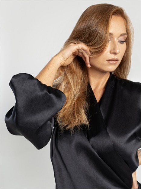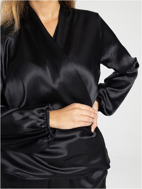 Durch die überlappenden 2 Seidenschichten im Vorderbereich, können Sie die Tiefe Ihres Dekolletés selbst variieren. Ein Gummi im Ärmelbündchen ermöglicht es, den Ärmel lässig zu schoppen.